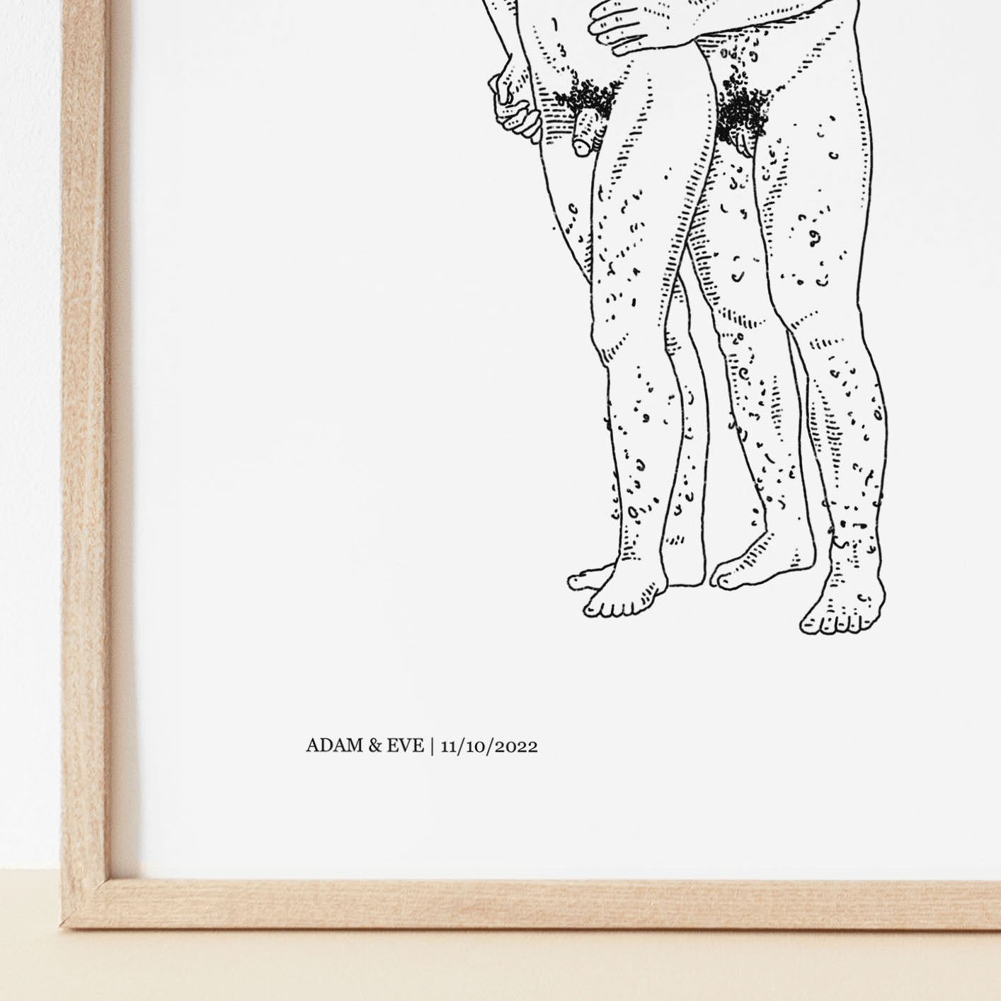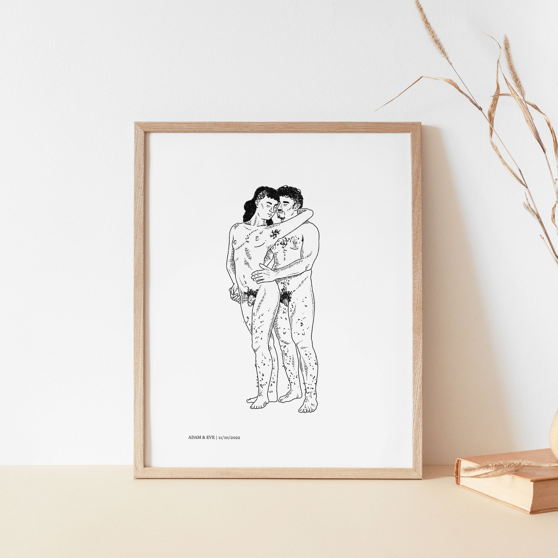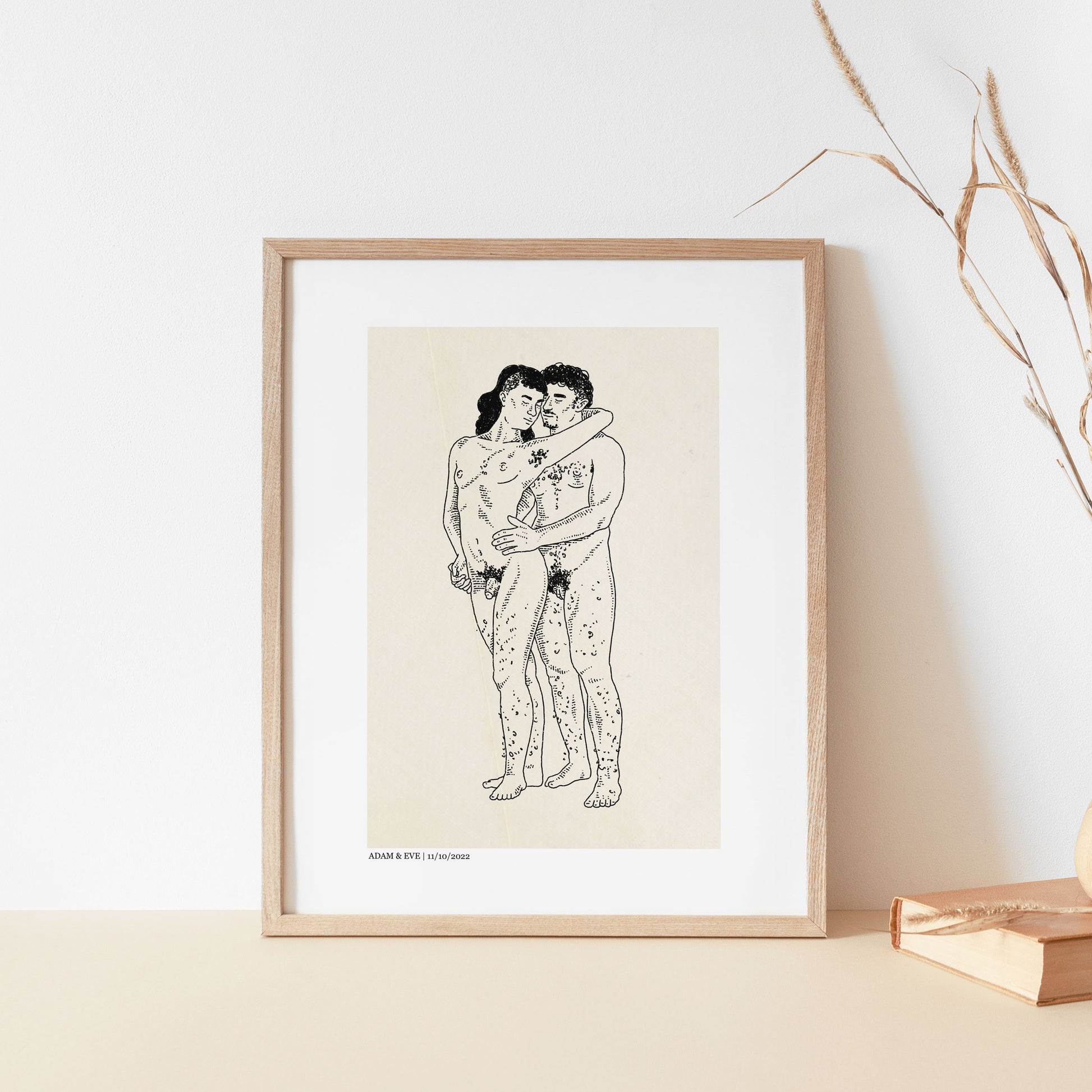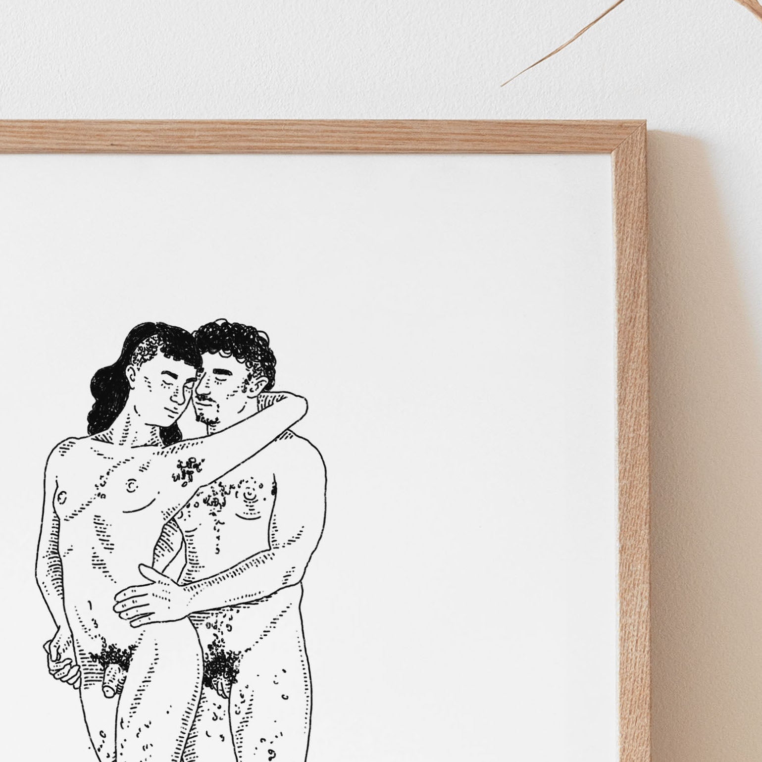 A line drawing of a trans masculine person and a trans feminine person embracing and posing as Adam and Eve.