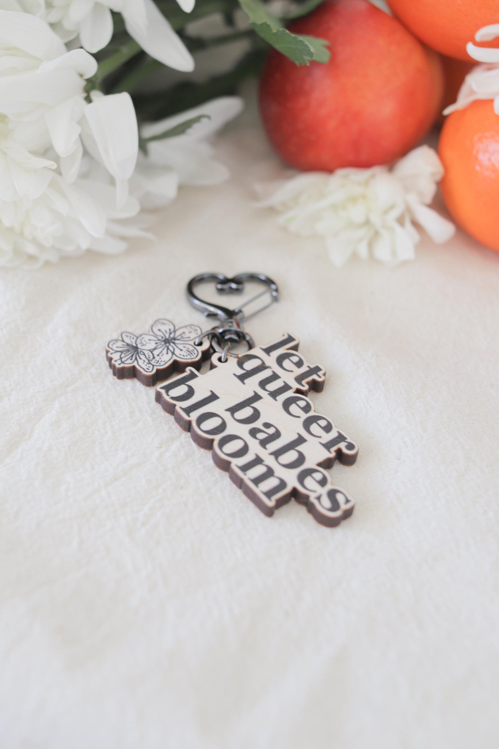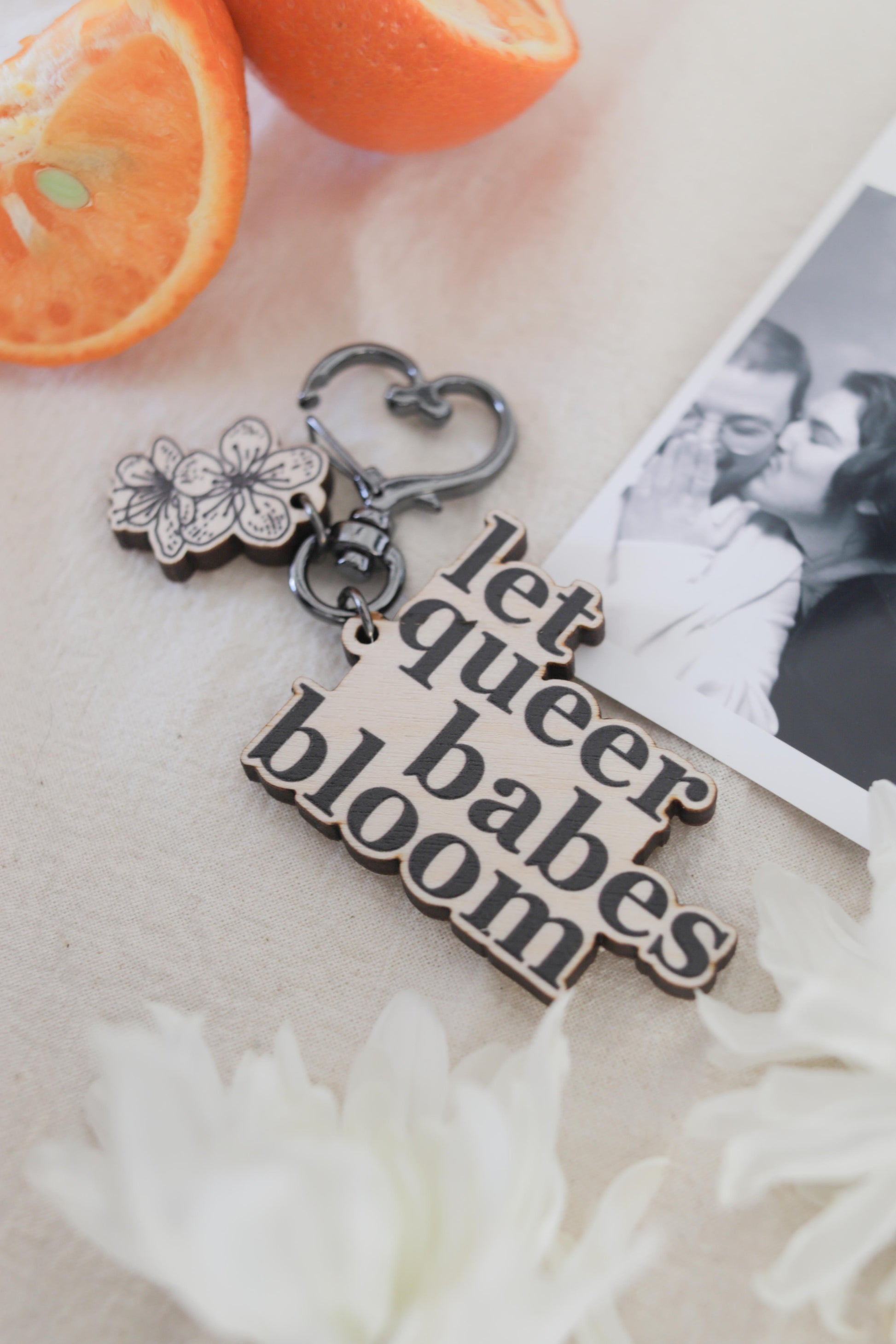 2" minimal wooden keyring which reads "Let Queer Babes Bloom" in matte black. Alongside it, is a smaller, 1" flower wooden keyring. Both are connected by a Heart Clasp in Gun Metal.