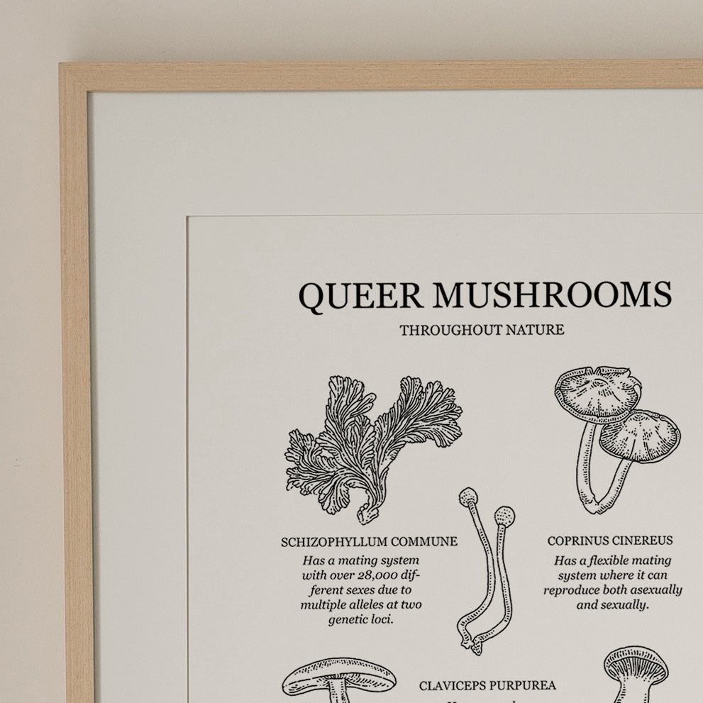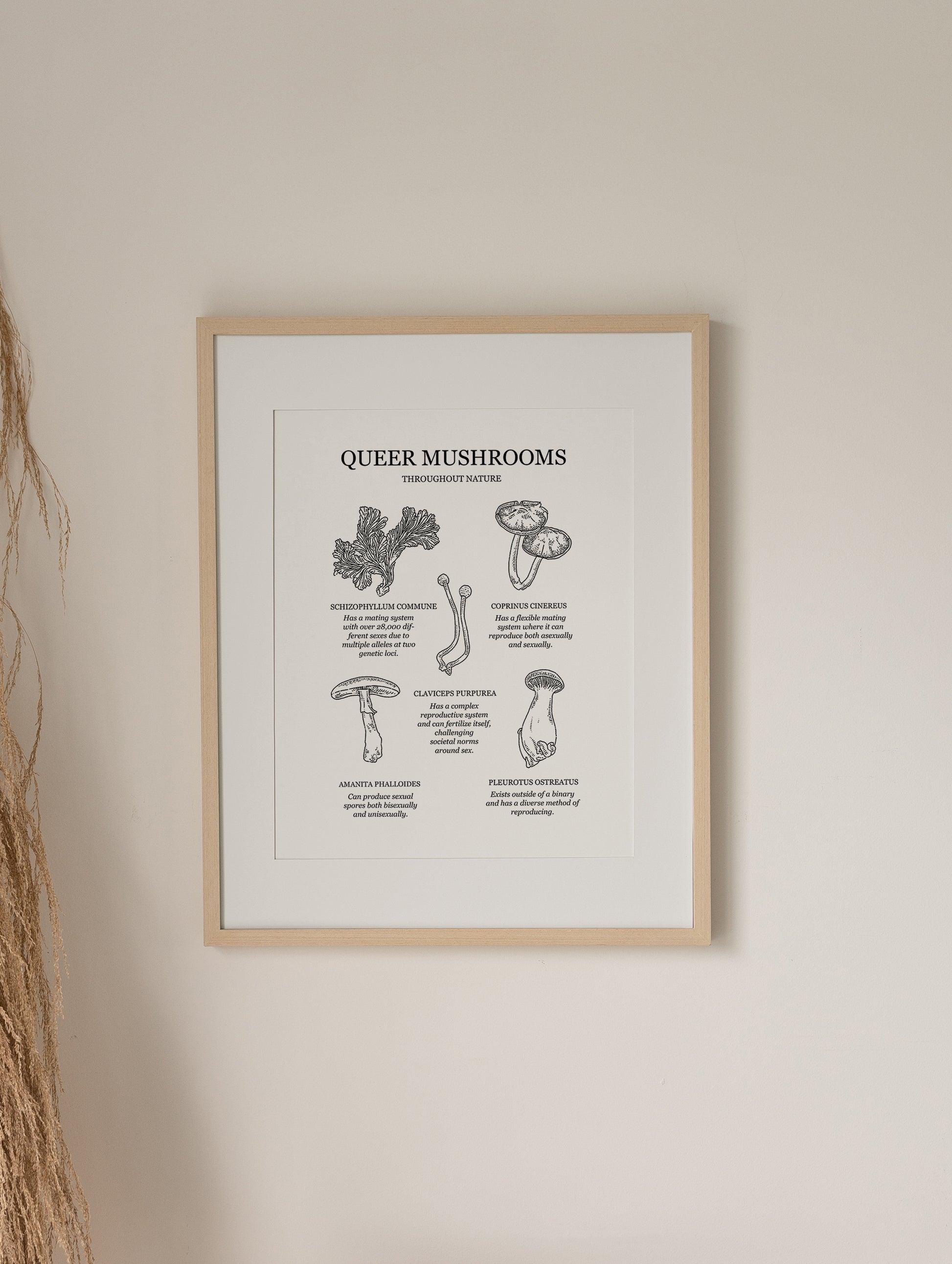 This art print celebrates the diversity and uniqueness of mushrooms, highlighting their queer nature. Perfect for anyone who loves fungi, nature, or simply wants to add a minimal print to their space.