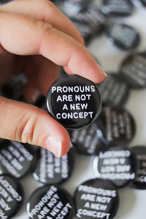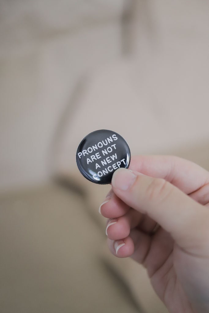 3.2cm/1.25" minimal badge with the words "PRONOUNS ARE NOT A NEW CONCEPT" in capitals. Badge is made with high quality metal with a pin backing. This is the perfect addition to any bag, jacket or pinboard!